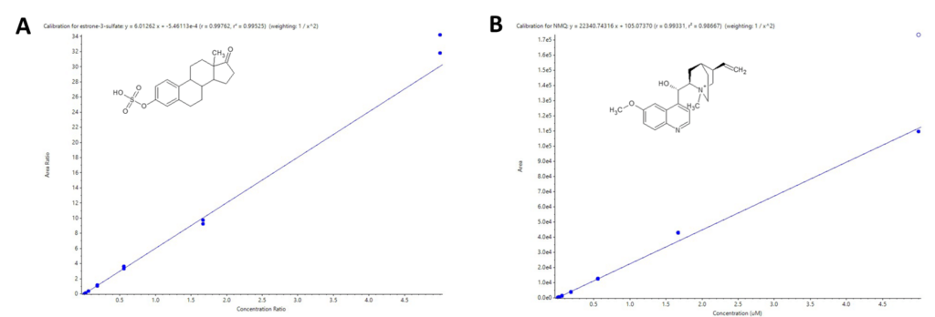 Calibration curves were established with E3S (range: 2.29 to 5,000 nM) for BCRP and NMQ (range: 2.29 to 5000 nM) for P-gp, achieving high linearity (see Figure 2), with analytical performance comparable to LC-MS/MS results. The lower limit of quantitation was suitable for the assay requirements.