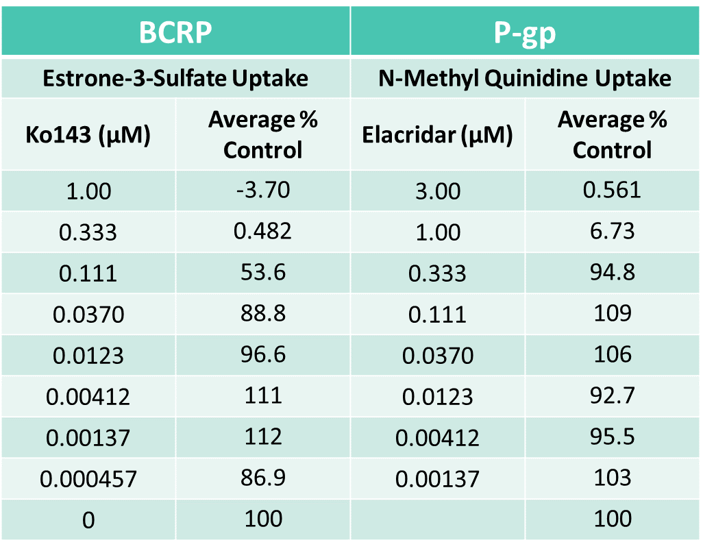 Prototypical inhibitors demonstrated concentration-dependent inhibition of substate transport for both BCRP and P-gp (see Figure 3). Ko143 inhibited transport of E3S by BCRP with an IC50 of 0.12 µM. Elacridar inhibited transport of NMQ with an IC50 of 0.58 µM. These values were comparable to values found in the literature.