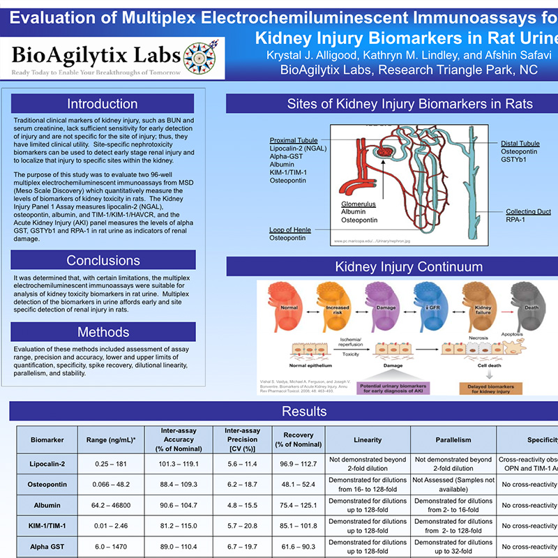 The purpose of this study was to evaluate two 96-well multiplex electrochemiluminescent immunoassays from MSD (Meso Scale Discovery) which quantitatively measure the levels of biomarkers of kidney toxicity in rats. The Kidney Injury Panel 1 Assay measures lipocalin-2 (NGAL), osteopontin, albumin, and TIM-1/KIM-1/HAVCR, and the Acute Kidney Injury (AKI) panel measures the levels of alpha GST, GSTYb1 and RPA-1 in rat urine as indicators of renal damage.