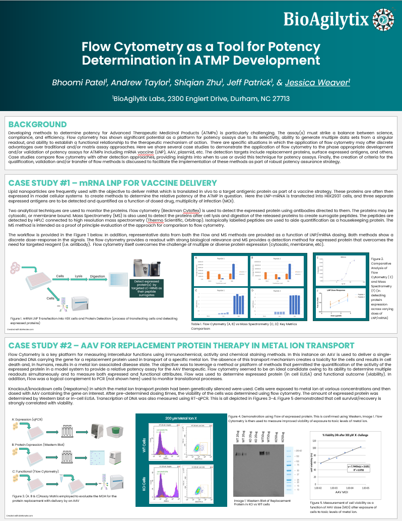 Scientific Posters Home Resources Scientific Posters Page 2 Development of a Novel Sample Pretreatment Method to Optimize Drug Tolerance and Maintain Sensitivity for Immunogenicity Assessment of Biotherapeutics​ – WRIB 2025 Find Out More Flow Cytometry as a Tool for Potency Determination in ATMP Development – WCBP 2025 Find Out More Screening Assays for Anti-AAV Antibodies in Support of Gene Therapies: TAb or NAb? Find Out More Development of an Immunocapture LC/MS Assay for Transgene Expression Quantification Using Commercially Available Anti-protein Antibody to Support Multi-species Gene Therapy Program Find Out More Pharmacokinetic Measurements of Exenatide in Rat Plasma by LC-MS/MS: A Case Study for the Application of Tandem Quadrupole Versus Quadrupole Time-of-Flight Methods Find Out More Validation of Anti-Adeno Associated Virus Serotype rh10 (AAVrh.10) Total and Neutralizing Antibody Immunogenicity Assays Find Out More Implementing Design of Experiment (DOE) in ADA Optimization for Targeted Therapeutics Find Out More A Single Neutralizing Antibody Assay for Detection of Anti-AAV9 Antibodies in Minipig and Human Serum Find Out More Development of Non-Cell Based Potency Assays for Bispecific Antibodies Find Out More Toxicokinetics of NIDO-361, a Potential Candidate to Treat Spinal and Bulbar Muscular Atrophy (SBMA), in Rats and Monkeys Following Oral Dosing in a 4-Week Toxicity Study Find Out More Previous 1 2 3 4 … 6 Next