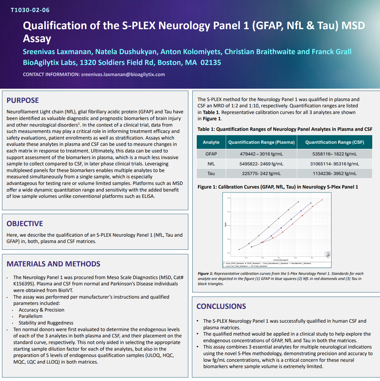 Neurofilament Light chain (NfL), glial fibrillary acidic protein (GFAP), and Tau have been identified as valuable diagnostic and prognostic biomarkers of brain injury and other neurological disorders. In the context of a clinical trial, data from such measurements may play a critical role in informing treatment efficacy and safety evaluations, patient enrollments as well as stratification. Assays which evaluate these analytes in plasma and CSF can be used to measure changes in each matrix in response to treatment. Ultimately, this data can be used to support assessment of the biomarkers in plasma, which is a much less invasive sample to collect compared to CSF, in later phase clinical trials. Leveraging multiplexed panels for these biomarkers enables multiple analytes to be measured simultaneously from a single sample, which is especially advantageous for testing rare or volume limited samples. Platforms such as MSD offer a wide dynamic quantitation range and sensitivity with the added benefit of low sample volumes unlike conventional platforms such as ELISA.