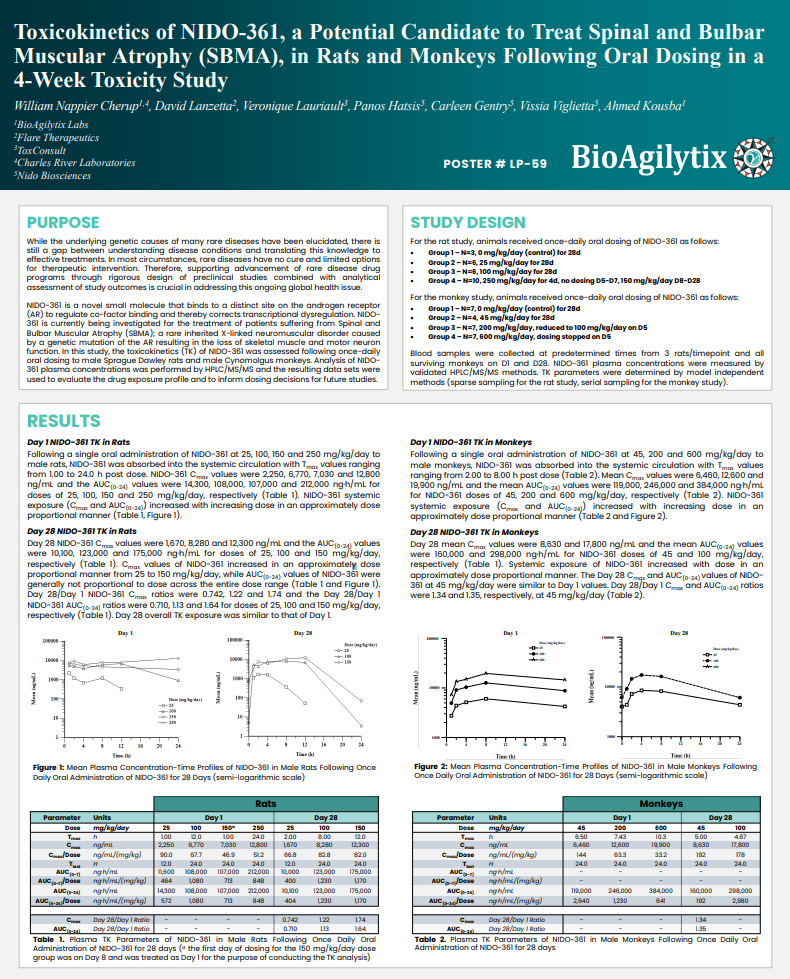 While the underlying genetic causes of many rare diseases have been elucidated, there is still a gap between understanding disease conditions and translating this knowledge to effective treatments. In most circumstances, rare diseases have no cure and limited options for therapeutic intervention. Therefore, supporting advancement of rare disease drug programs through rigorous design of preclinical studies combined with analytical assessment of study outcomes is crucial in addressing this ongoing global health issue. NIDO-361 is a novel small molecule that binds to a distinct site on the androgen receptor (AR) to regulate co-factor binding and thereby corrects transcriptional dysregulation. NIDO361 is currently being investigated for the treatment of patients suffering from Spinal and Bulbar Muscular Atrophy (SBMA); a rare inherited X-linked neuromuscular disorder caused by a genetic mutation of the AR resulting in the loss of skeletal muscle and motor neuron function. In this study, the toxicokinetics (TK) of NIDO-361 was assessed following once-daily oral dosing to male Sprague Dawley rats and male Cynomolgus monkeys. Analysis of NIDO361 plasma concentrations was performed by HPLC/MS/MS and the resulting data sets were used to evaluate the drug exposure profile and to inform dosing decisions for future studies.