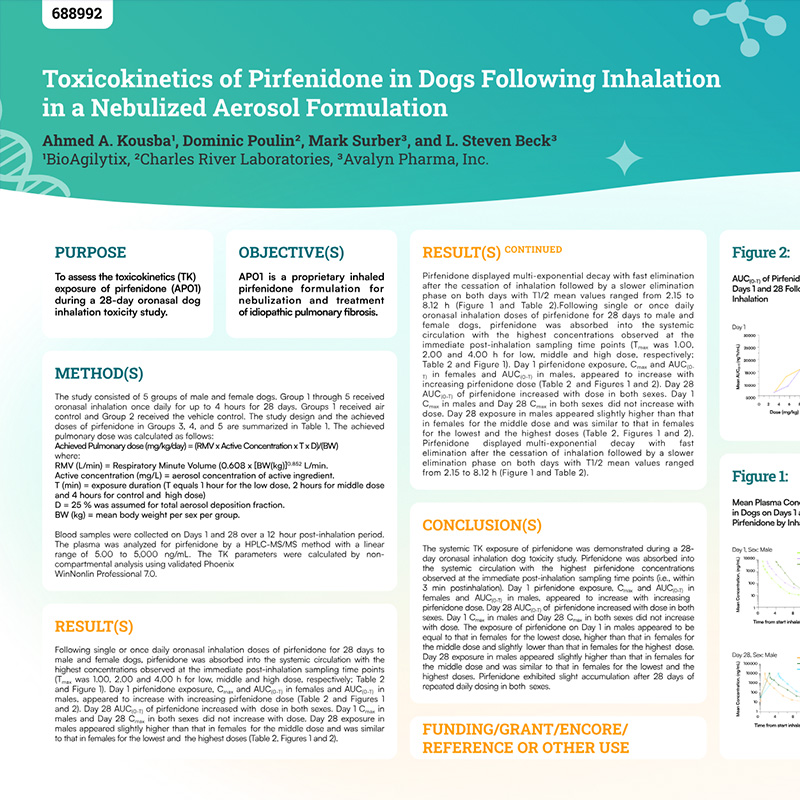 To assess the toxicokinetics (TK) exposure of pirfenidone (AP01) during a 28-day oronasal dog inhalation toxicity study.