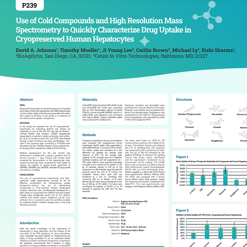 Using cold compounds, we wanted to present a compelling set of data to show that hepatocytes and HRAM spectrometry can be used to obtain at least screening-quality information with regard to whether a test article is a substrate of the solute carrier uptake transporters.