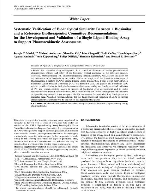 Our scientific teams continue to stay involved in the latest industry and regulatory aspects of supporting biosimilars and other investigative therapeutic modalities. Our teams have contributed to a number of publications specific to biosimilars, including: